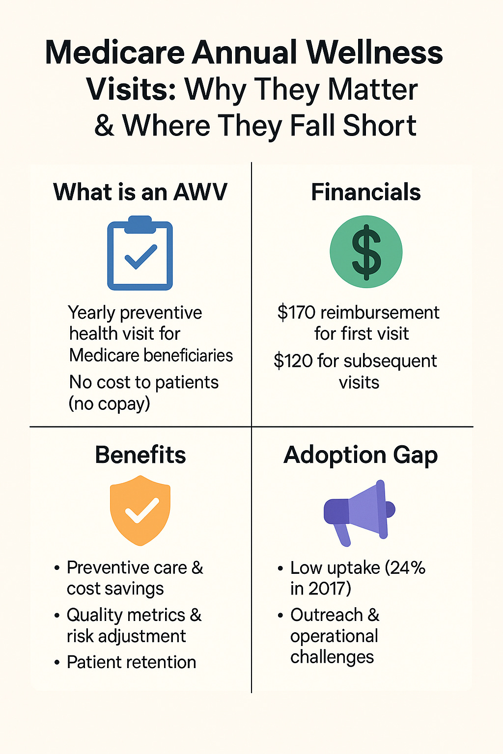 Despite these benefits, AWV adoption has been far lower than expected. Only about 24% of eligible Medicare beneficiaries received an AWV in 2017 (up from 7.5% in 2011), meaning roughly three-quarters of seniors miss out on this preventive service. That low uptake represents millions of missed opportunities for preventive care and significant unrealized revenue for practices. The reasons are largely operational. Conducting AWVs at scale is hard. Primary care clinics face numerous practical challenges in trying to expand AWV volume: